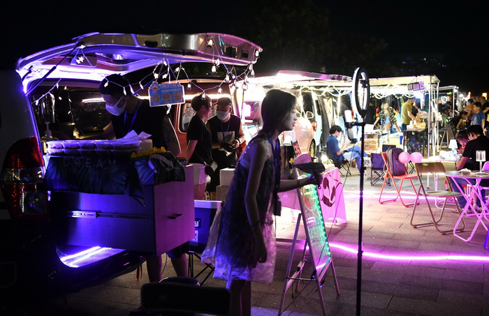 7月8日晚,夜幕降临,福建福州青年会广场上,整整齐齐地停放着数十辆汽车,车主们利用后备厢展销琳琅满目的自制产品,热闹的创意“后备厢集市”吸引市民、游客前来感受“烟火气”。