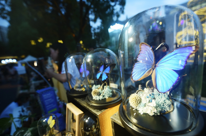 “落日夜市”中的一个小摊子上摆放着用蝴蝶做成的艺术装置。