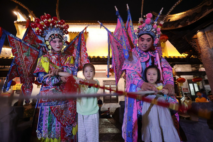2022年7月9日,浙江湖州,德清县新市古镇“戏曲夜市”开市,戏曲演员上演经典京剧剧目。