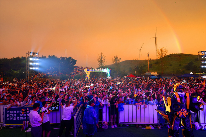 伴随着如潮歌声,人们挥舞着手中的荧光棒,尖叫声、欢呼声此起彼伏。现场还出现了一道彩虹。
