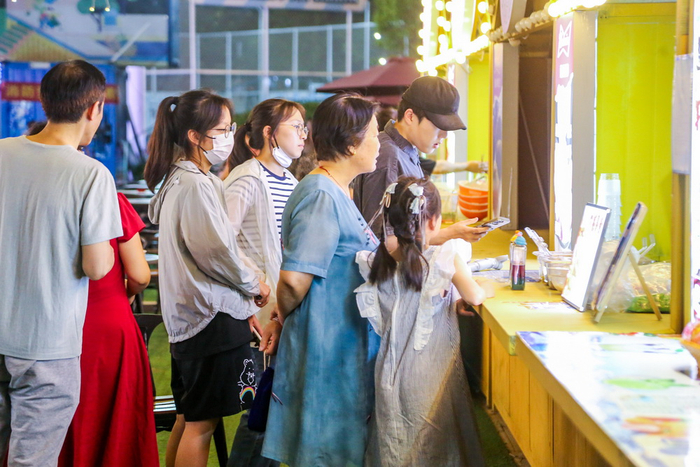 7月7日,郑州市民游客在“高新夜巷”排队品尝食物。