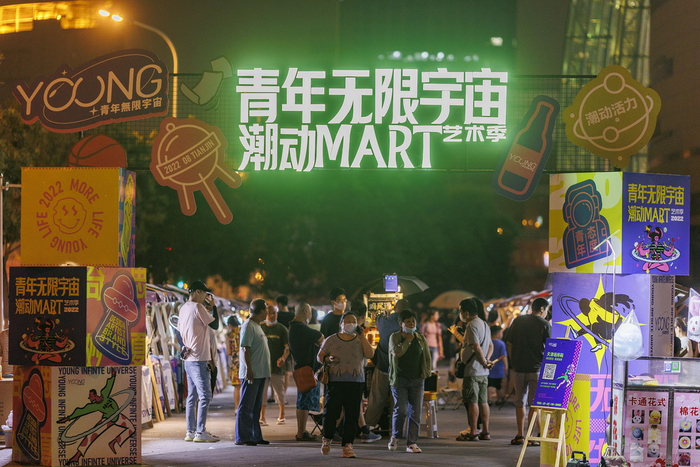 2022年6月30日,天津大悦城南马路外广场举办“青年无限宇宙潮动Mart”市集,夜市内游人如织。