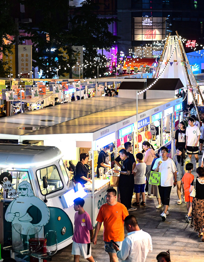大悦城南马路外广场举办“青年无限宇宙潮动Mart”市集,夜市内游人如织,汇聚艺术、国潮、饰品、手作、文创等主题创意,众多艺术品牌与手工匠人齐聚现场,丰富了市民的夜间消费生活。