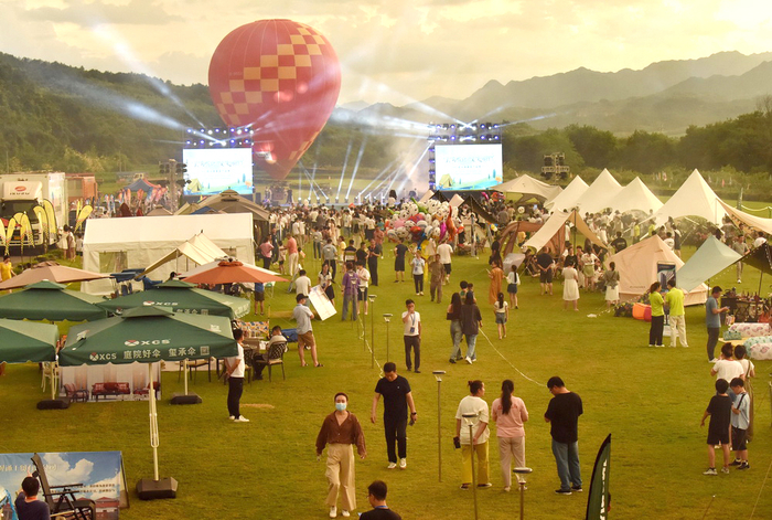 7月9日,位于湖北宜昌百里荒旅游度假区“2022帐篷露营季暨荒野星空烟花音乐节”开幕,来自宜昌、武汉、荆州、荆门等地的上万名游客相约百里荒,尽情享受音乐、焰火、露营体验带来的夏日狂欢。“白天享受美景,晚上和音乐一起摇摆,看焰火宿帐篷,这种体验太美好了。”来自武汉的游客孙亚洁女士表示,百里荒独特的草原风光和清凉气候深受家人喜爱。