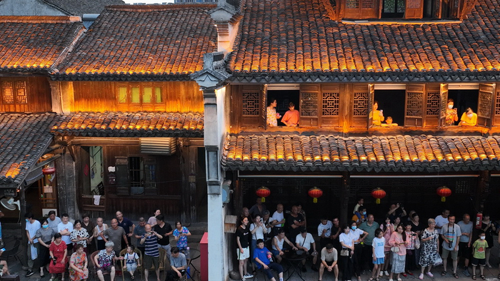 2022年7月9日,浙江湖州,德清县新市古镇“戏曲夜市”上,市民和游客正在观看演出。