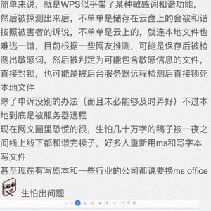 在本次事件中,有很多人表示,此次WPS信任危机受到最大冲击的或是内容创作者们,动辄几十万字的文章如果因为被审核泄露,或者被封禁,都将触及到商业利益。但实际上,WPS的使用者除了个人消费群体之外,还有更加庞大的企业和政府用户,而这些用户的信息如果被泄露或者被不当利用,后果不堪想象。