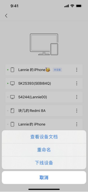 在随行面板上点击工位电脑的名称,就可以看到电脑上正打开的文档,用手机就能继续操作。前提是,用户需开启文档云同步且文档是打开状态。在随行面板中,还支持查看自己登录过的设备。若借用他人电脑临时登录忘记退出,可以使用手机下线账号。保障文档安全,防止被查看隐私。