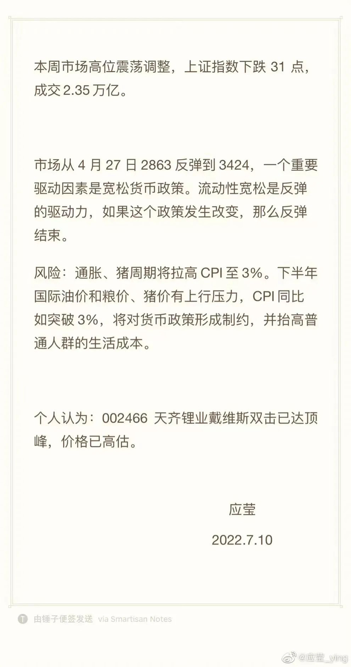 7月10日,应莹在她个人公众号上发布了第二篇“每周市场点评”,在文中她提及,“个人认为天齐锂业戴维斯双击已达顶峰,价格已高估。”然后呢,这短短一句话就成了断魂刀,第二天,“锂茅”天齐锂业最终跌9.16%,报收134.45元,市值跌去了200亿左右。不仅如此,整个锂矿板也全线下挫,融捷股份和盛新锂能跌幅超8%,赣锋锂业跌去了近7%。
