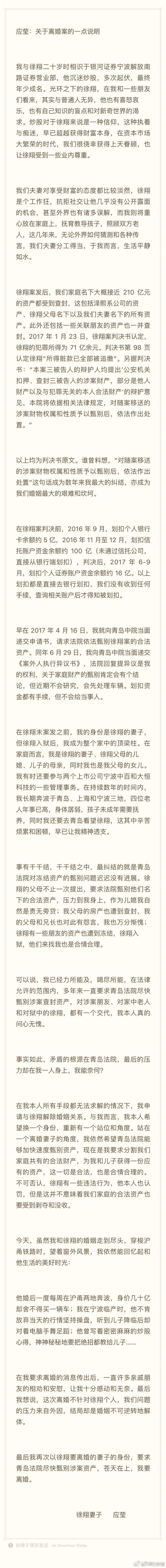 2019年的7月31日,应莹接到上海黄浦区法院通知,她与徐翔离婚案,将于8月底在青岛监狱进行审理。紧接着,就在2019年七夕节(8月7日)这一天,应莹发布了一篇名为名为《苍天在上,我要离婚!》的文章,这也是她在社交平台上首次发文。