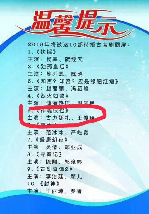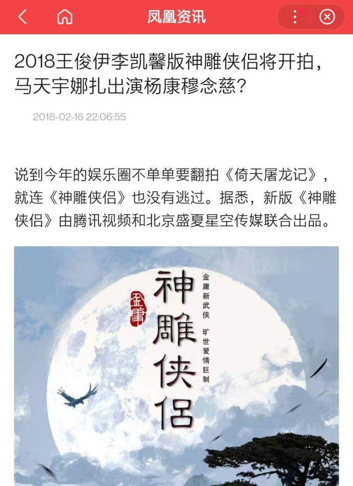 电视剧方面。2018年,腾讯发布翻拍《神雕侠侣》的消息。王俊伊开始入场,在当时的一些所谓的“新闻通稿”里,都说他将出演男主角,包括李沁、古力娜扎、李凯馨的人都争着和王俊伊搭档合作。