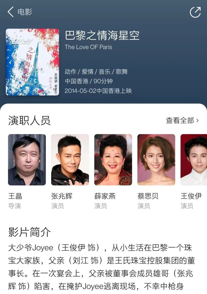 看似没什么问题,实际上破绽百出。资料显示,《巴黎之情海星空》由王晶执导,演员除了王俊伊,还有张兆辉、蔡思贝、薛家燕等人,甚至还有剧情简介和上映日期。不过,整部电影只有一张没有人物的海报,没有剧照,网上也没有任何关于这部电影的视频信息。