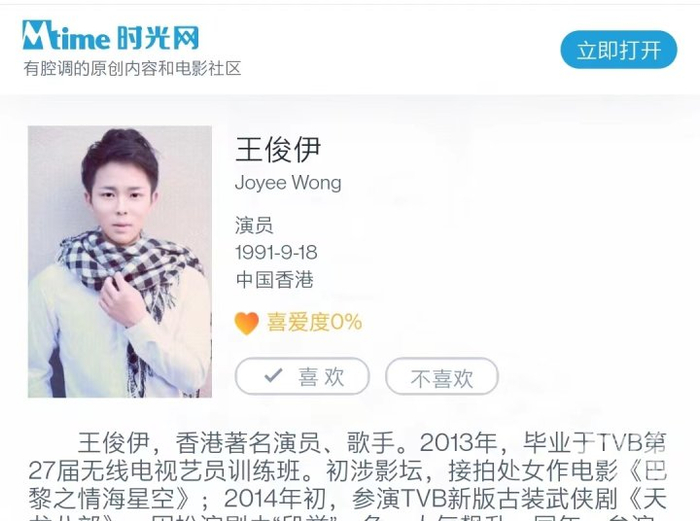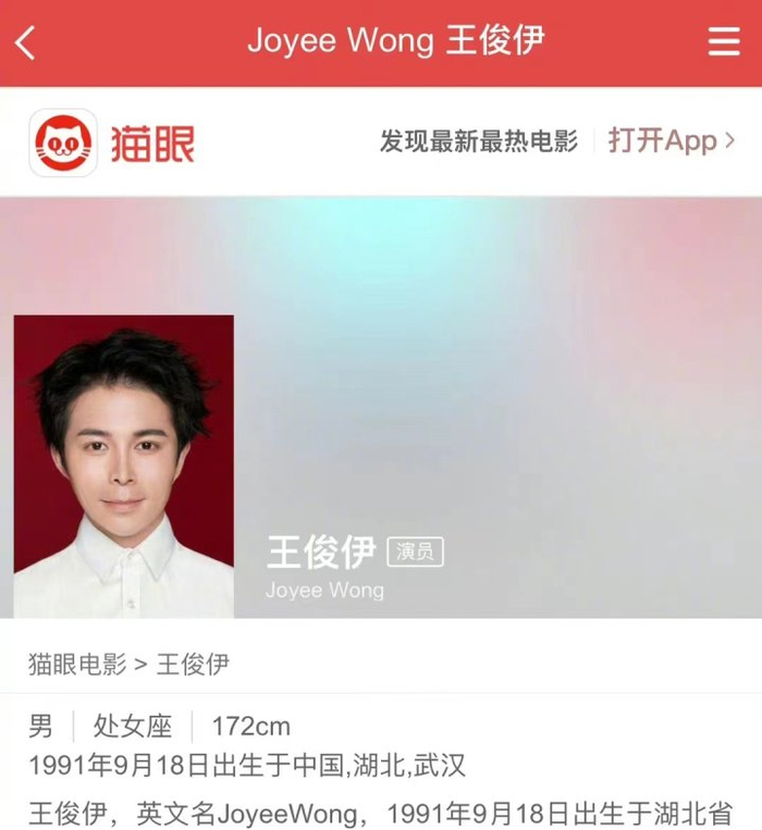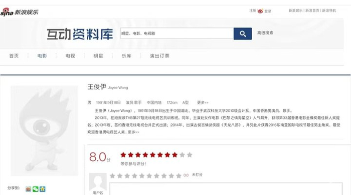 很多平台都被这个“王俊伊”忽悠了,包括百度(目前百度百科已经删除)、新浪、时光网、猫眼在内的多个平台都有他的个人资料。