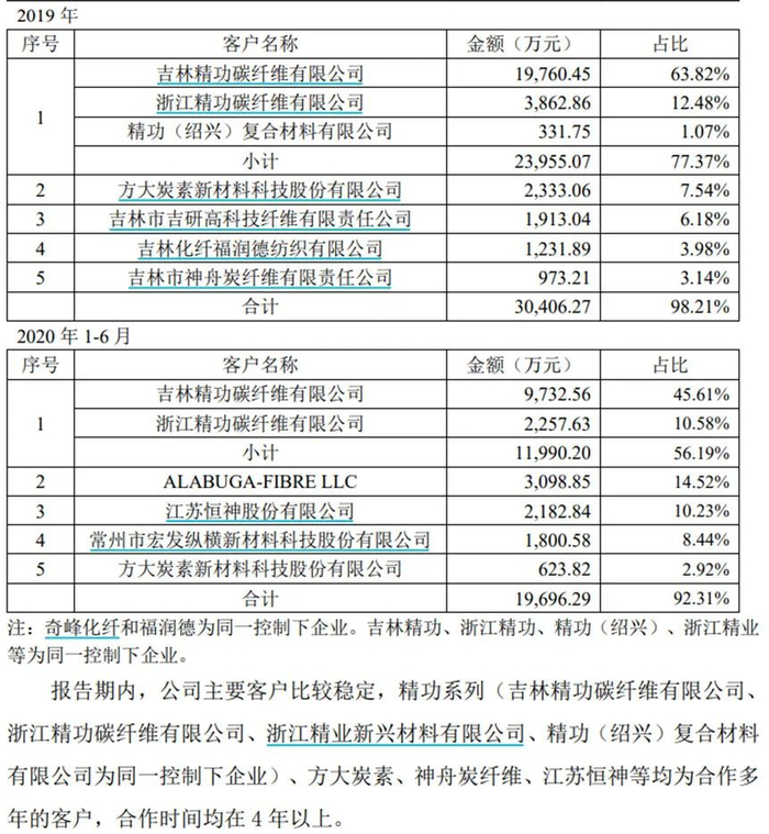 吉林碳谷主营碳纤维原丝,下游为碳纤维厂家。招股书显示,浙江精功碳纤维有限公司、吉林精功碳纤维有限公司和精业新兴是其主要客户,这几家公司实际控制人,均为精功集团。