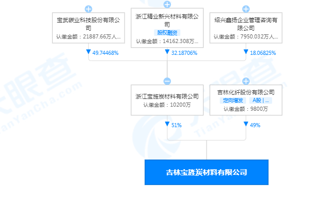 宝武碳业招股书申报稿显示,吉林宝旌,曾用名为吉林精功碳纤维有限公司,其中更名后的浙江宝旌持股51%,吉林化纤持股49%。