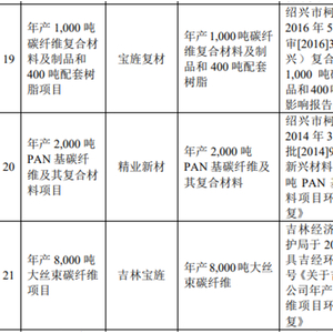 资料显示,宝武碳业正在运行的碳纤维项目包括:宝旌复材年产1000吨碳纤维复合材料及制品和400吨配套树脂项目;精业新材年产2000吨PAN基碳纤维及其复合材料项目;还有吉林宝旌在运作的年产8000吨大丝束碳纤维。上述三项目环评已验收完成。