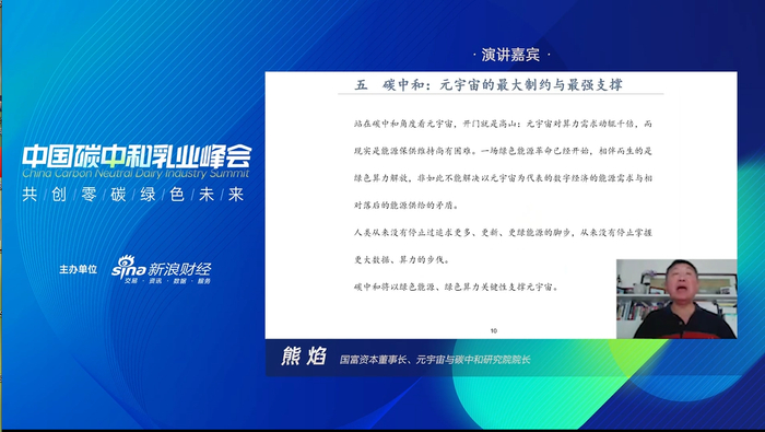 在峰会上,国富资本董事长、元宇宙与碳中和研究院院长熊焰表示,碳中和既是中国作为负责任的大国的一个重要的表征,同时也是中国对于人类命运共同体的一个承担责任,同时也是中国国内高质量发展的一个基础的要求,或者叫做碳中和是新时期高质量发展新的规则体系,碳中和的本质是技术革命推动下的能源革命与产业重构。