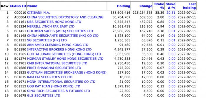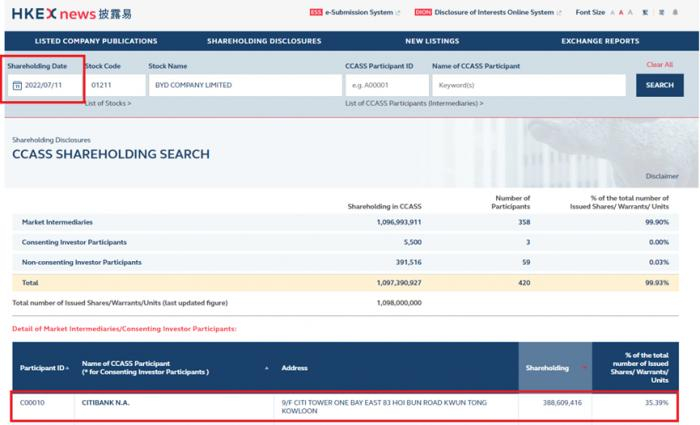 港交所CCASS数据显示,比亚迪股份(1211.HK) 有225,234,363股于7月11日被转让给花旗银行。