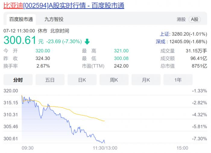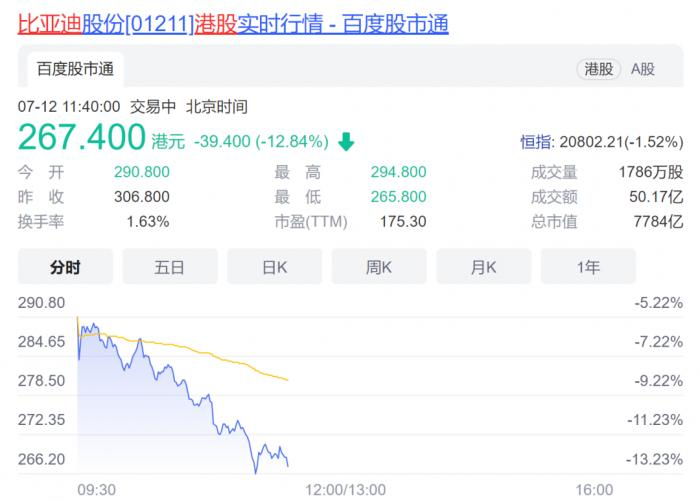 7月12日港股开盘后,比亚迪股份股价暴跌,盘中一度跌幅超9%,截至发稿,跌近13%。A股市场上,比亚迪跌超6%,截至收盘报跌7.3%;市值已回落到万亿下方。