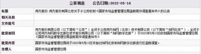 2022年5月14日,同方股份有限公司子公司收到了《国家市场监督管理总局垄断案件调查通知书》,公告显示,国家市场监督管理总局将于2022年5月13日开始对同方股份有限公司全资子公司同方知网技术有限公司、全资子公司同方知网数字出版社技术股份有限公司进行反垄断调查。