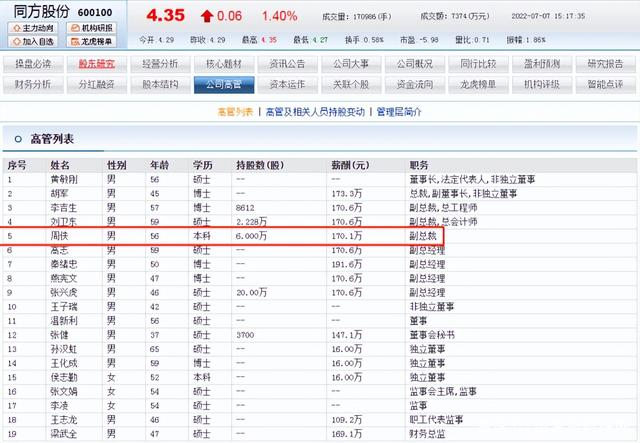 同方股份副总裁周侠已56岁 很早就被提拔如今薪酬为170.1万
