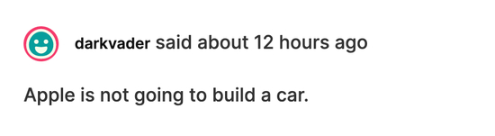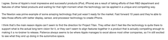 有人认为,“苹果造车,就像苹果进入电视/电影行业一样,花好几年时间摇摆不定,最终才找准自己的位置。”