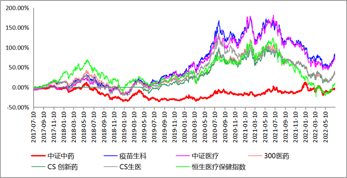 截至2022年7月8日,中证医药指数近5年的累计涨幅为-5.1%,也就是下图中的红色线,远远跑输其他医药主题类指数。同期,国证疫苗与生物科技指数(蓝色线)和中证医疗指数(粉红色线)表现较好,区间累计涨幅分别达到77.79%和71.13%。另外,300医药、中证创新药和中证生物医药指数等涨幅均超过30%。