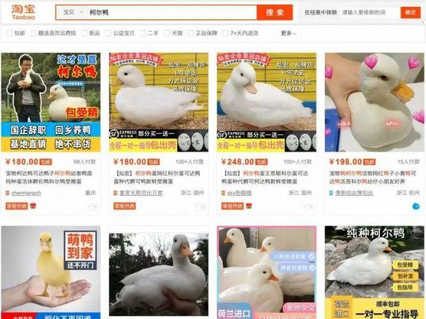 在淘宝上,还有很多卖柯尔鸭蛋的店铺,买家可以自己在家孵化的,卖家称“包出壳”。鸭蛋按照出壳鸭子的不同品质等级,售价不同。便宜的一两百元一个,贵的四五百元,等级最高的七八百元。除了鸭蛋,也有刚出壳的鸭苗卖,同样按照等级区分价格,便宜的1000多元,贵的近3000元,而成年鸭子的价格就要上万元左右了。