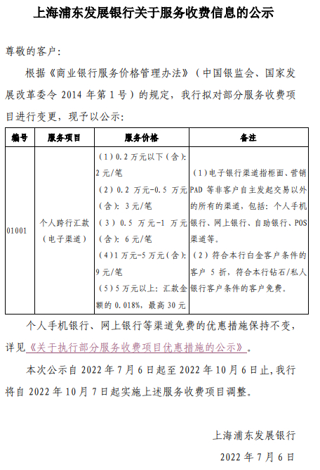 浦发银行回应:办理个人跨行转账业务仍免收手续费