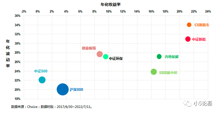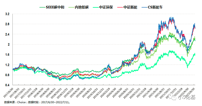 从图中可以看出:走势最浪的无疑是中证新能和CS新能车,碳中和和内地低碳似乎有点越走越像的趋势,而中证环保你就说是不是不看也罢呢?