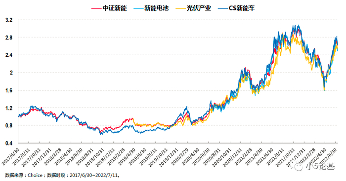 基于数据的可得性,上述只列了5个指数(新能电池和中证光伏的数据部分缺失),且数据是从2017年6月30日开始的。
