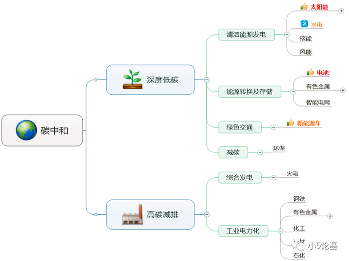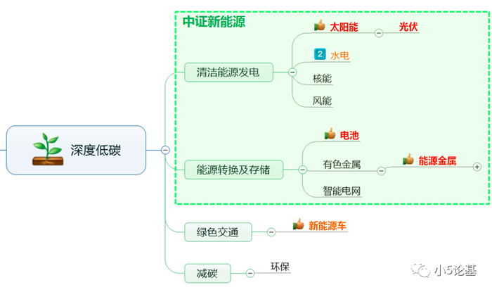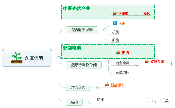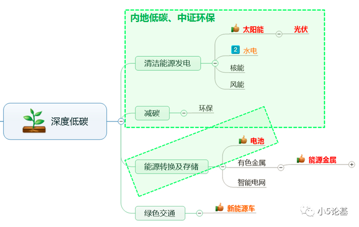 相较于高大全的SEEE碳中和指数,内地低碳指数只重点涉及“深度低碳”部分的清洁能源、减碳和储能这三大部分,其中最重要的子板块无疑是清洁能源里面的太阳能(光伏)、水电和储能里的电池。