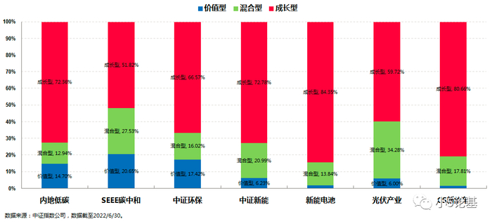 特别是中证新能源、新能电池、中证光伏、CS新能车这几个指数,成长风格极为明显,且几乎可以忽略其价值占比。