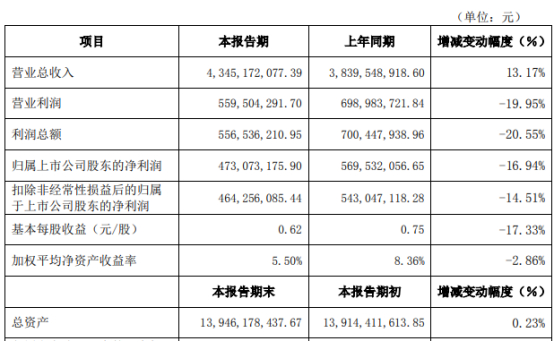 报告期内,公司实现营业总收入43.45亿元,较去年同期增长13.17%。实现归属上市公司股东的净利润4.73亿元,较去年同期下降16.94%。