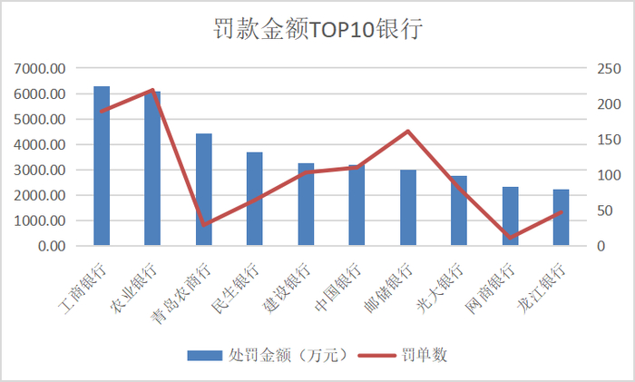 具体从单家银行的处罚情况来看,被罚金额前十中,国有大行占比较大。其中,工商银行被罚金额最高,累计被罚6271.69万元;其次是农业银行,被罚金额达6096.20万元,罚单数219张则是最多;青岛农商行紧随其后,虽然仅收罚单29张,但被罚达4410万元;再者是民生银行、建设银行和中国银行,被罚金额均在3000万至4000万之间;最后是邮储银行、光大银行、网商银行和龙江银行,被罚金额在2000万至3000万之间。