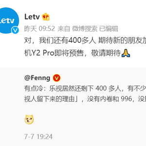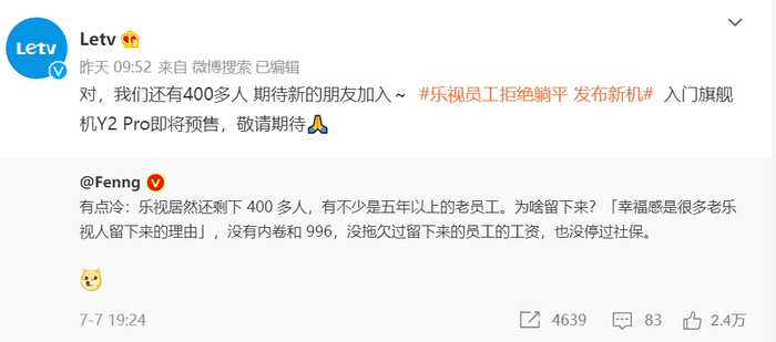 7月11日,乐视的官方微博账号@Letv转发了这条微博,并且回复称:“对,我们还有400多人,期待新的朋友加入。”而且还很敬业地宣传了一下“入门旗舰机Y2 Pro即将预售”的消息,并称:“乐视员工拒绝躺平。”