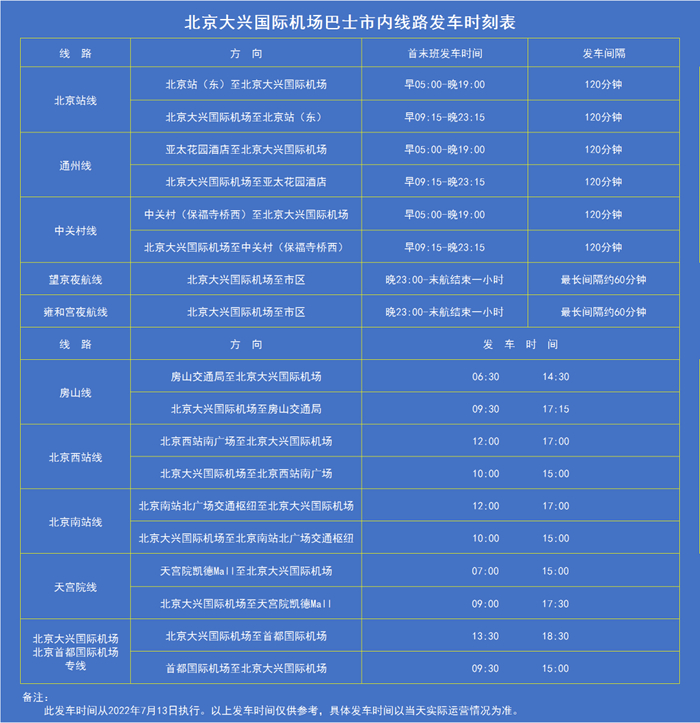 二、对大兴机场5条线路运营时间作出调整,分别为大兴机场中关村线、大兴机场通州线、大兴机场北京西站线、大兴机场房山线和大兴机场北京站线。