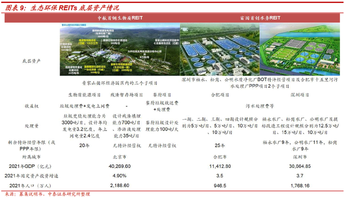 目前发行的2单生态环保类REITs中,中航首钢生物质REIT的底层资产为鲁家山循环经济园区内的三个子项目,包括生物质能源项目、残渣暂存场项目、餐厨项目,其中生物质能源项目成最主要的底层资产,主营生活垃圾焚烧发电,剩余特许经营年限20年;残渣暂存场项目为生物质能源项目的配套服务设施,2018年开始运营,用于暂时存储焚烧炉渣,不产生收入;餐厨项目主要为收运与处理餐厨垃圾,无特许经营权,该项目2020年出租给了首钢生态,2021年转回。