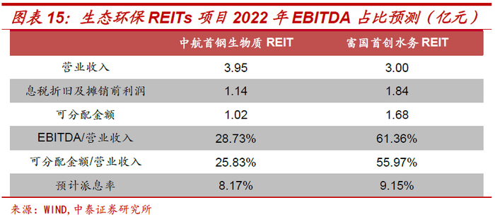 生态环保REITs收益期主要受特许经营权剩余期限的影响。中航首钢生物质REIT生物质能源项目剩余特许经营年限20年;残渣暂存场项目和餐厨项目无特许经营权。富国首创水务REIT中,合肥项目的剩余运营年限约为25年,深圳项目中福永水厂剩余特许经营权约9年、公明水厂约11年、松岗水厂约9年。