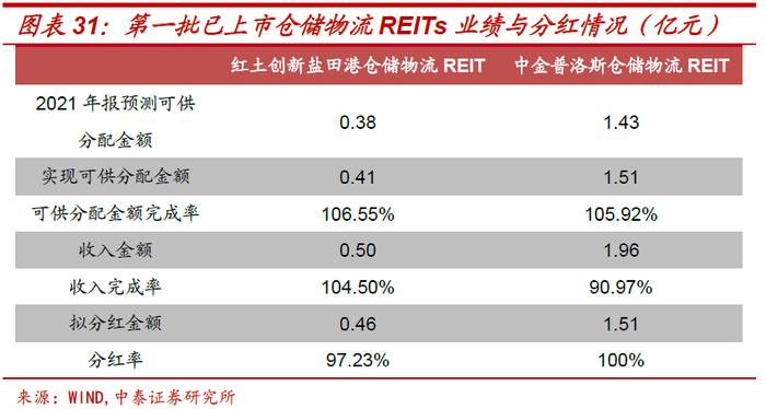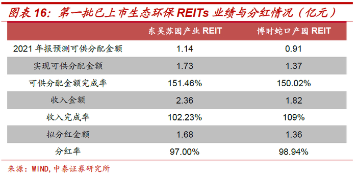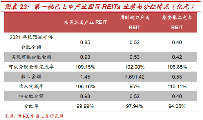 从第一批已上市产业园区REITs的经营与分红情况来看。富国首创水务REIT、中航首钢生物质REIT可供分配金额、收入以及分红率都达到了预期水平。
