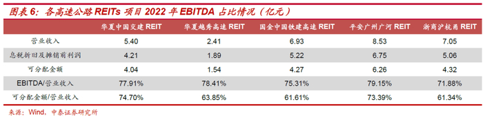成本方面,付现成本包括运营付现成本(人员费用、路产管理费用以及维修养护费用等)、税金及附加、基金管理费和托管费等费用;非付现成本主要是折旧和摊销等,收入扣减付现成本后加上一些列调整后得到可供分配金额。根据各高速公路REITs项目的募集说明书,2022年各个项目EBITDA占营业收入比重在70%-80%之间,可分配金额占营业收入的比例为60%-80%之间,也就是说国金中国铁建高速REIT、浙商沪杭甬REIT的付现成本、本金偿还及利息支付、所得税、资本开支和营运资金变动、项目托管费和基金管理费等占比相对较高。