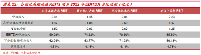 成本方面,付现成本包括运营付现成本(租赁营销费、行政管理费、能源费、维护保养费等)、税金及附加、基金管理费和托管费等费用;非付现成本主要是折旧和摊销等,收入扣减付现成本后加上一些列调整后得到可供分配金额。根据各园区基础设施REITs项目的募集说明书,2022年各个项目EBITDA占营业收入比重在55%-75%之间,可分配金额占营业收入的比例为55%-75%之间,其中华安张江光大REIT的付现成本、本金偿还及利息支付、所得税、资本开支和营运资金变动、项目托管费和基金管理费等占比相对较低,建信中关村REIT则相反。