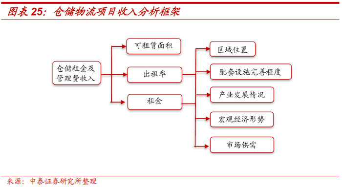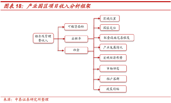 产业园区REITs和仓储物流REITs的盈利模式均为收取租金和物业管理费收入,其中租金收入占比较大,租金收入由出租率和租金水平共同决定,受所处区位、园区定位、产业发展情况、区域配套设施完善程度、宏观经济形势、租户客群、政策补贴、未来入市竞品等多种因素影响。