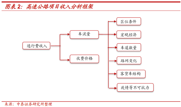 由于底层资产属性的不同,不同资产类型、不同行业的公募REITs在资产估值方面,特别是未来现金流的测算方面所需要考虑的因素不尽相同。高速公路收入主要为向车辆收取通行费收入,通行费收入由车流量和收费价格共同决定的,其中收费价格相对稳定,而车流量受区位条件、宏观经济、车道数量、路网变化、疫情等不可抗力影响等多种因素的影响。