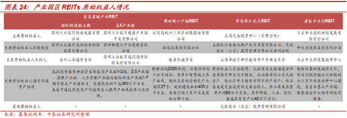 产业园区REITs原始权益人均为国资背景,能够有效保障REITs的稳定运营。其中,博时蛇口产园REIT的原始权益人为央企,招商蛇口为A股上市公司(001979.SZ),融资渠道通畅。除此之外,其他产业园区累REITs的原始权益人均为开发区管委会。此外,原始权益人持有、运营、拟开发的其他园区资产较为丰富,有助于未来REITs的扩募。