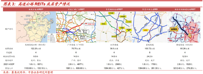 目前,已发行或正在发行的5只高速公路REITs的区位条件均较为优越,途径城市经济经济较为发达,人口相对密集。具体来看,浙商沪杭甬与平安广州广河的底层资产分别为杭徽高速、广河高速,位于长三角、珠三角地区,越秀高速和中交高速的底层资产为汉孝高速和嘉通高速,均在湖北省境内,国金铁建的底层资产为渝遂高速,位于成渝经济圈。