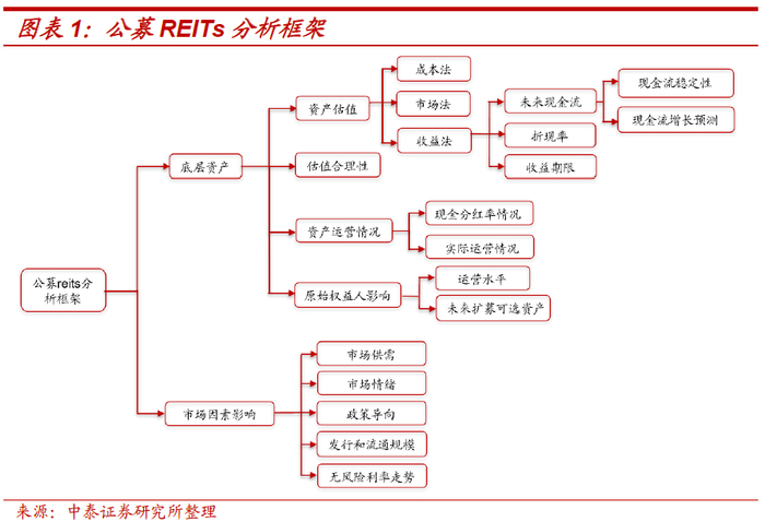 公募REITs的分析框架主要包含两个维度:底层资产和市场因素影响。