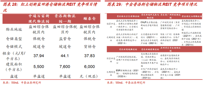 竞争性项目方面,盐田港项目的竞品主要为中通百富新现代物流园、普洛斯物流园一期等,相比于可比项目,盐田港项目有一定优势,一方面,外部管理机构具有强大的客户资源,包括国内外知名企业,如美集物流、德迅物流、日新物流、全球捷运物流等;另一方面,相比于其他梯库项目,现代物流中心属于4层坡道库,优质的坡道库较之梯库更方便货物装卸运输,效率更高。普洛斯项目的竞品较多,底层资产中所涉及的物流业区均位于经济发达地区,市场需求旺盛,规划前景良好;周边道路交通便利,部分临近机场等交通枢纽,是重要的仓储物流节点。同时,普洛斯公司具有运营优势,有一定竞争优势。