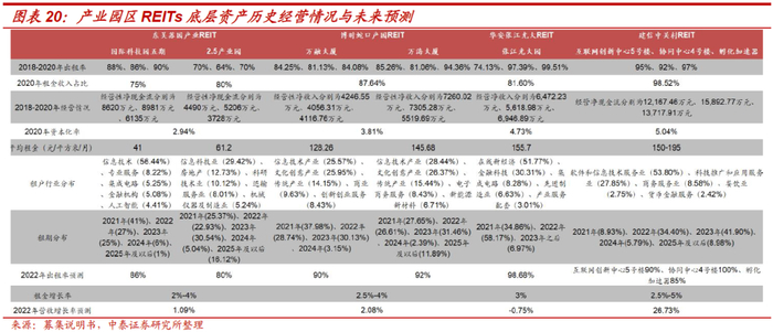 收入方面,2020年受疫情影响,受租金减免政策的影响,2020年部分资产的经营性收入有所下降。从资本化率来看,2020年建信中关村REIT的资本化率最高为5.05%,底层资产位处北京上地区域,区内高新技术产业发达,主力IT行业租户有较高的承租能力,资产盈利能力较强,对于2022年的营收增长率预测也最高。