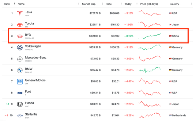 与此同时,全球车企市值排行榜上,比亚迪入榜全球汽车市值前三,仅次于特斯拉和丰田。