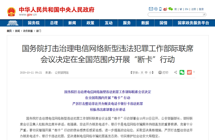 2020年10月10日,国务院召开打击治理电信网络新型违法犯罪工作部际联席会议,决定在全国范围内开展“断卡”行动,严厉打击整治非法开办贩卖电话卡、银行卡违法犯罪。人民银行要求银行业金融机构、非银行支付机构要按照“谁开卡、谁负责”的原则,落实主体责任,强化风险防控。